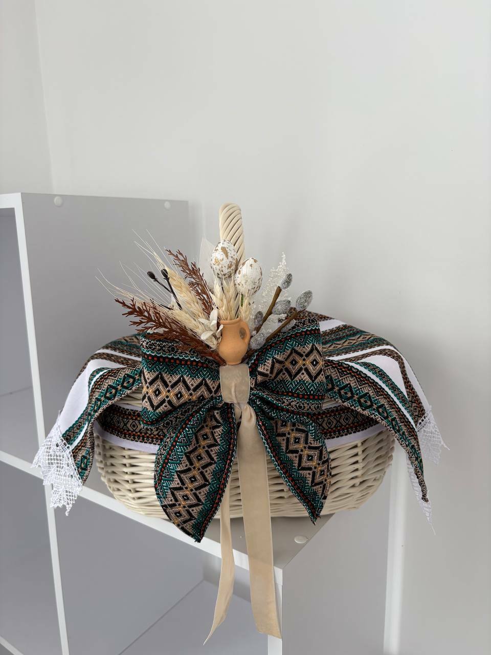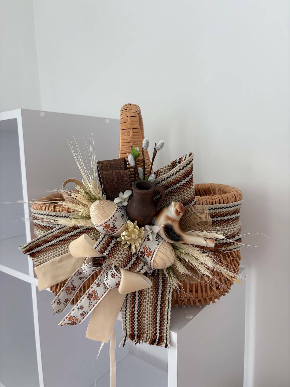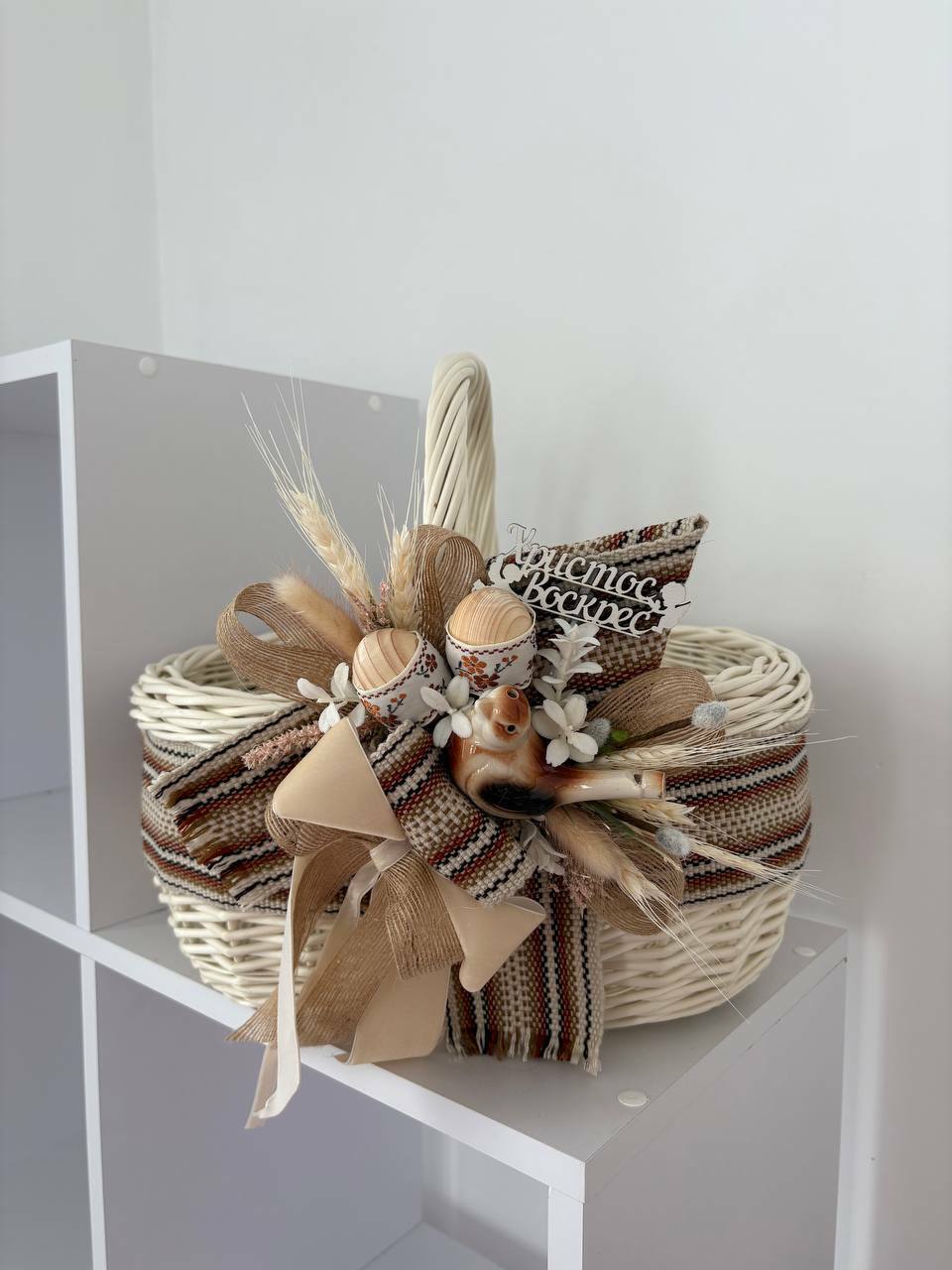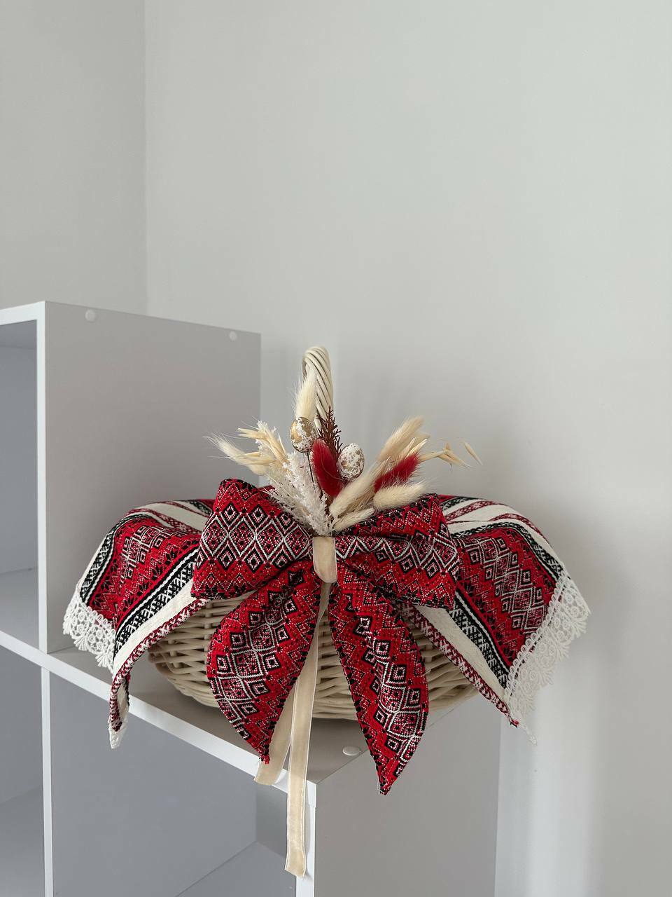 Набір: кошик+бантик з декором+ стрічка кругом кошика+серветка.