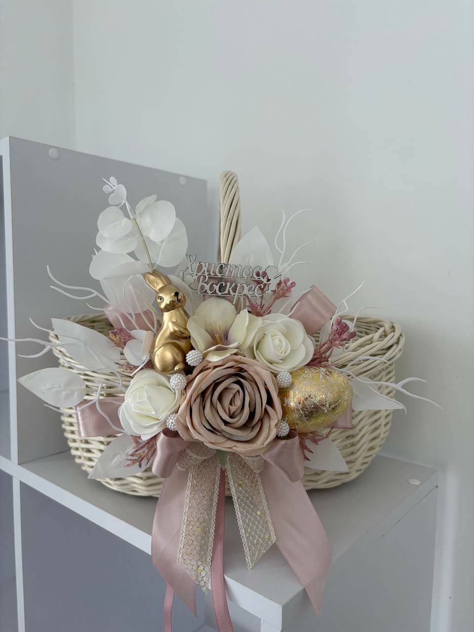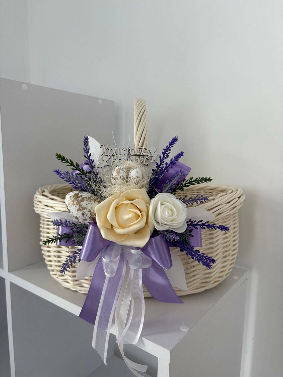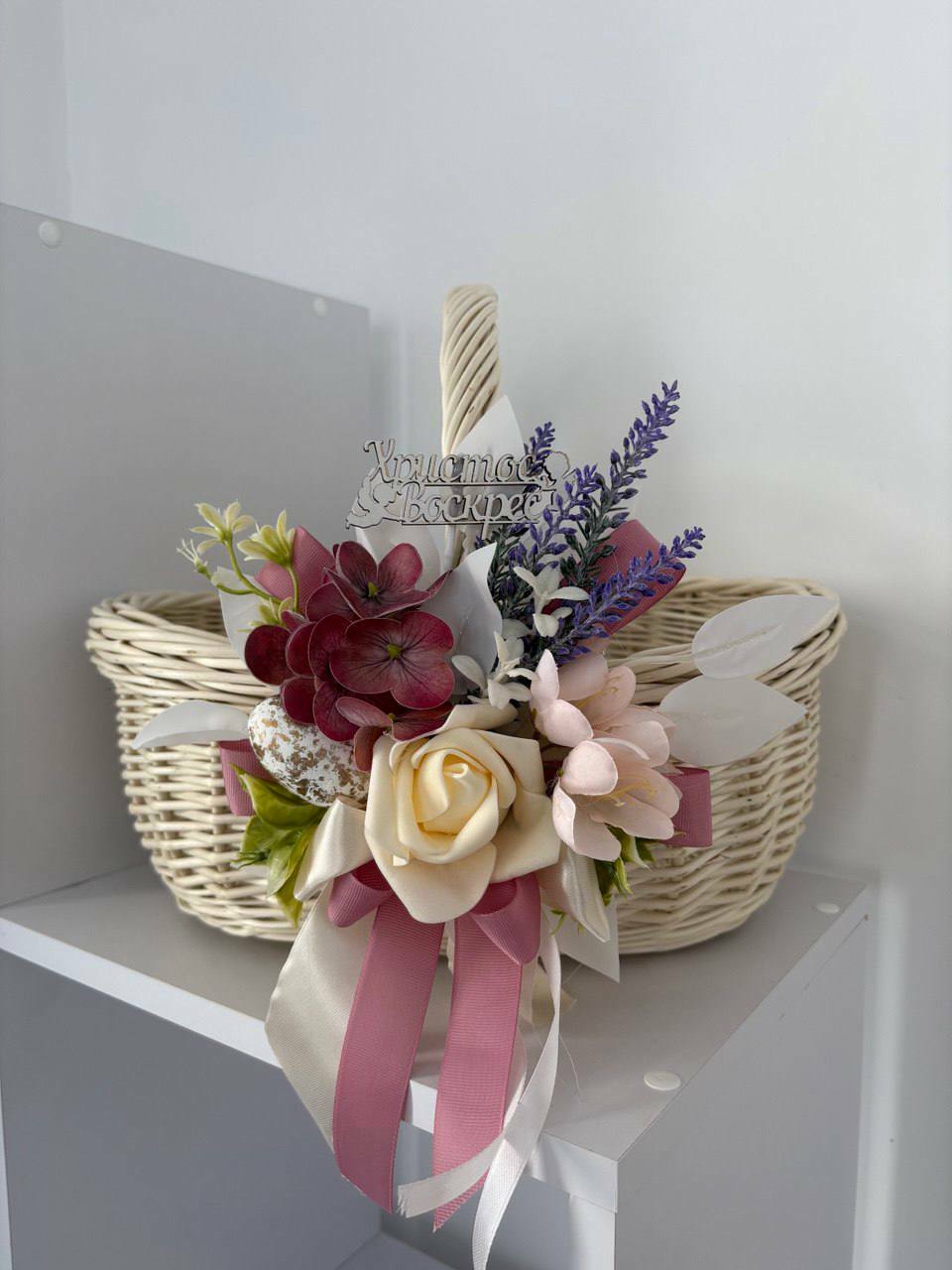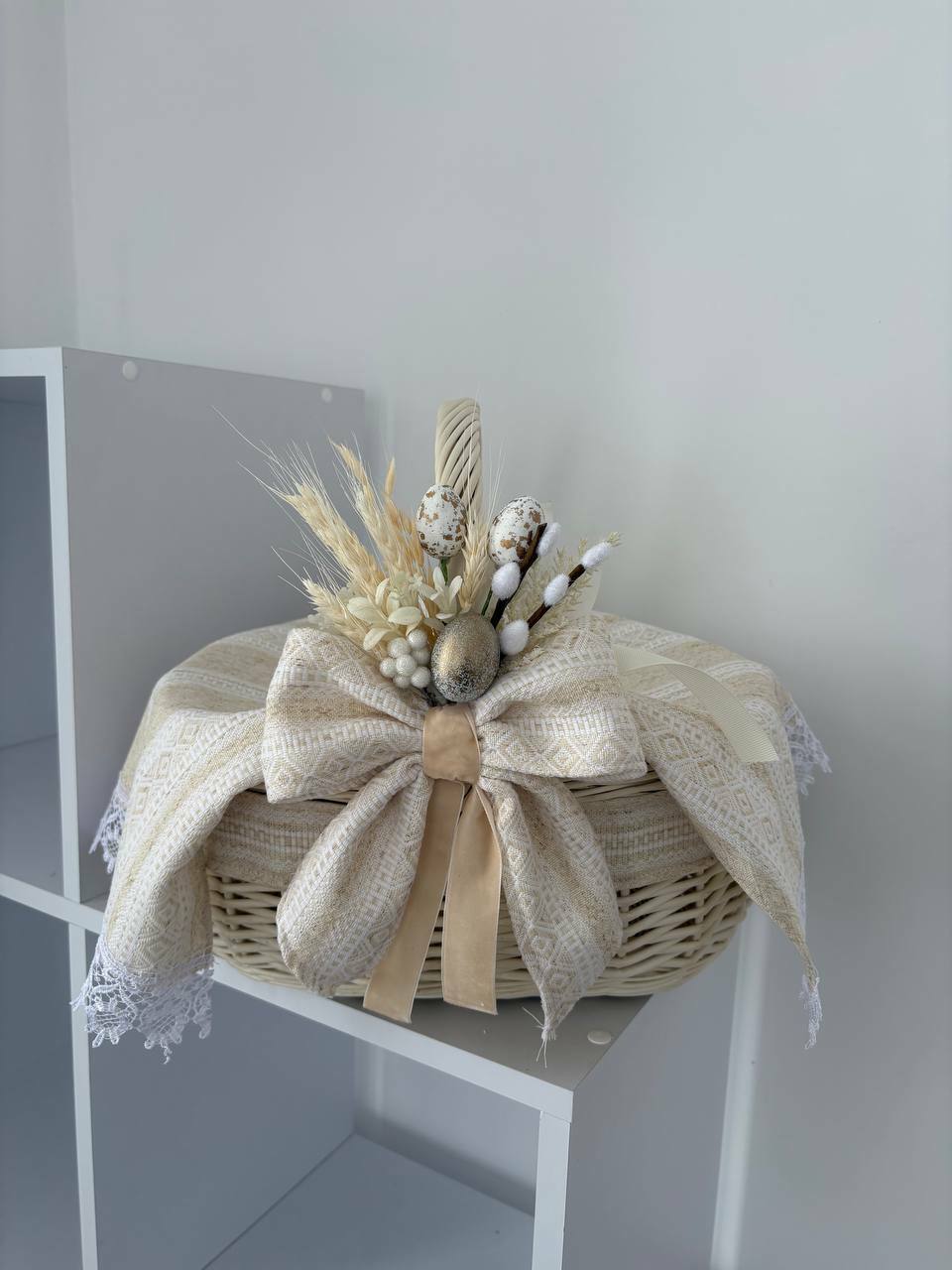 Набір: кошик+бантик з декором+ стрічка кругом кошика+серветка.