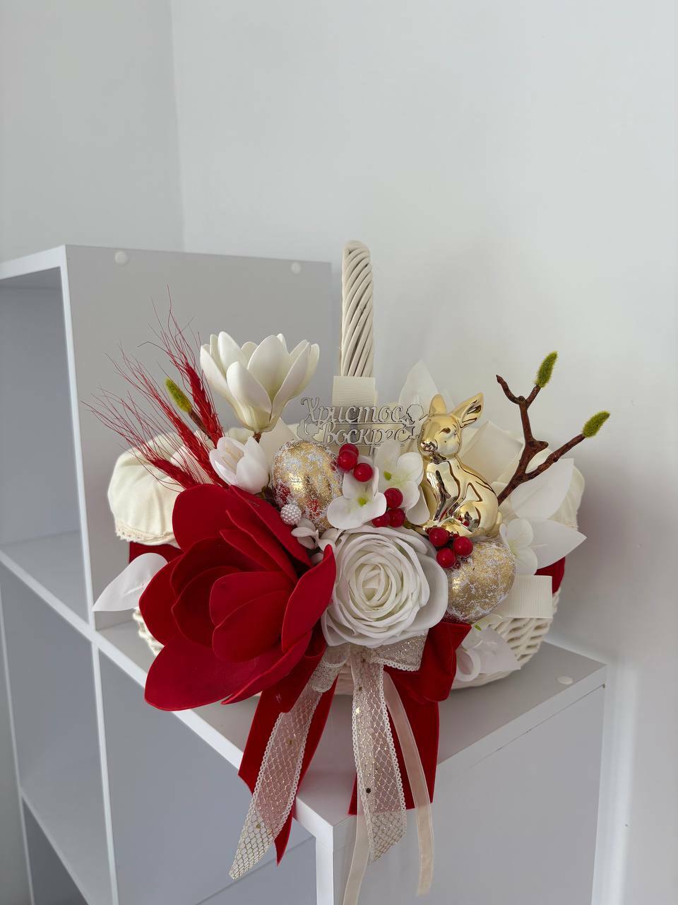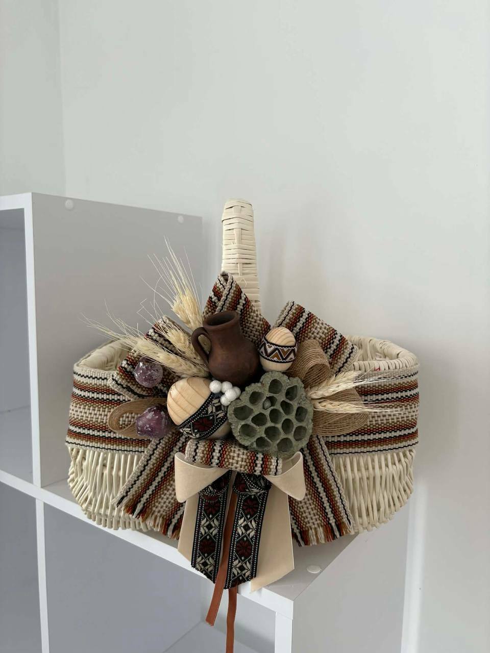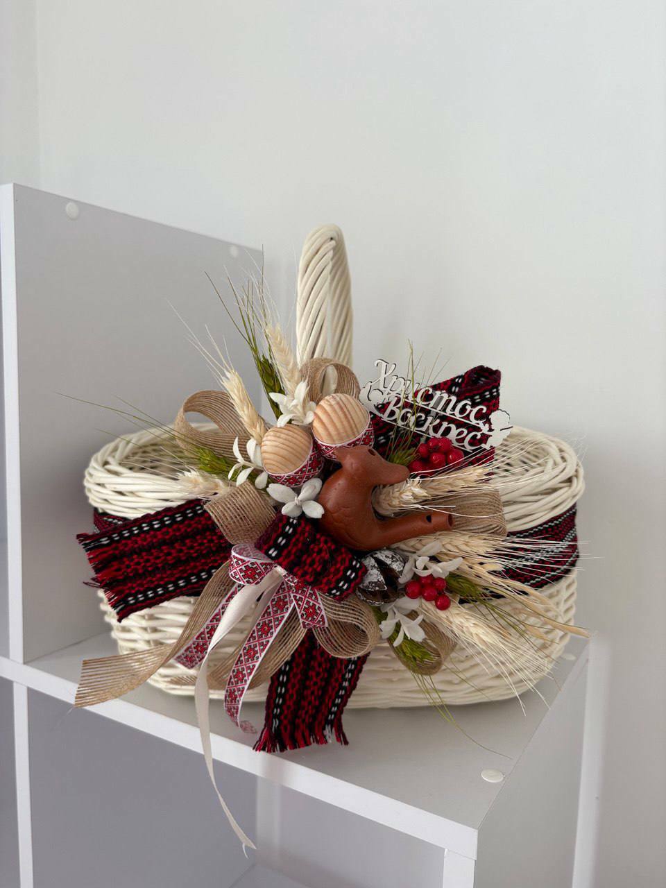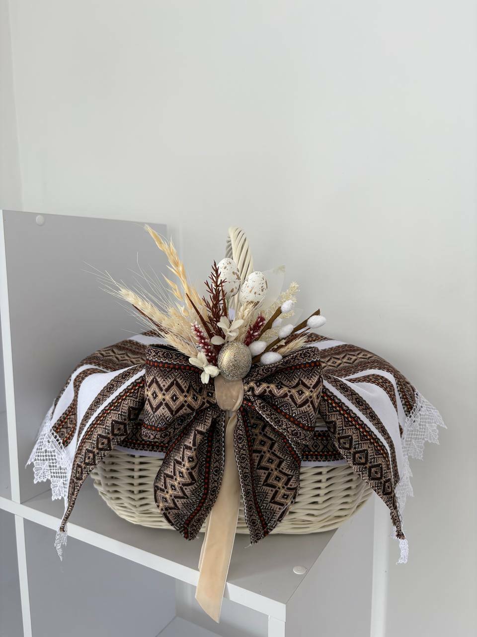 Набір: кошик+бантик з декором+ стрічка кругом кошика+серветка.